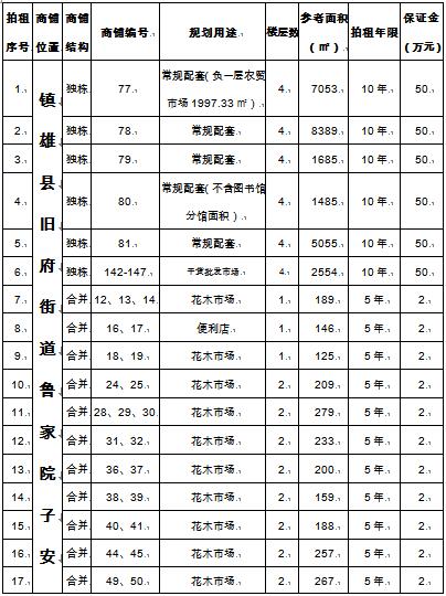 十二、拍租會地點:鎮(zhèn)雄縣燈光球場(鎮(zhèn)雄縣烏峰鎮(zhèn)五一路48-49號)。